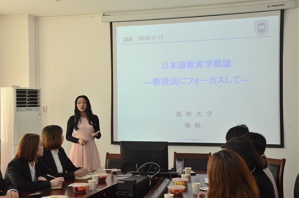 杨帆教授开展了关于教学法的讲座。主要从目前日语教学现状、日本语教育学框架、授课法、课堂活动四个方面介绍日本语教育学概论。她表示,在课程设计上,应从是什么、教什么、怎么教三个方面入手。她讲道,以语法译读法为代表的传统的背诵等形式,重视形成语音习惯,而以自然教育法,交流教育法为代表的,重视运用能力,传达意思。接着,杨教授通过实例,详细介绍了TPR、OPI等教学方法,并从导入、练习、确认三个阶段讲述课堂活动技巧。