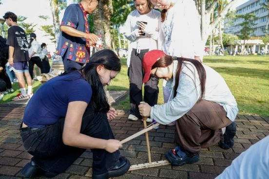 钻木取火体验为课堂核心环节,传承人们分步骤演示弓钻法、手钻法、绳钻法三种钻木取火方式,从工具准备、操作姿势到力度控制,逐一讲解关键技巧。演示过程中,钻木处逐渐产生白烟,当火光成功燃起时,现场响起热烈掌声与欢呼声。随后的体验环节中,同学们迫不及待地亲身体验。在传承人手把手的指导下,大家分组实践,努力转动手中的木棒,深刻体会着先民开拓生存之路的艰辛与智慧。外国留学生也热情参与其中,跟随传承人学习取火技巧,成功点燃火种。