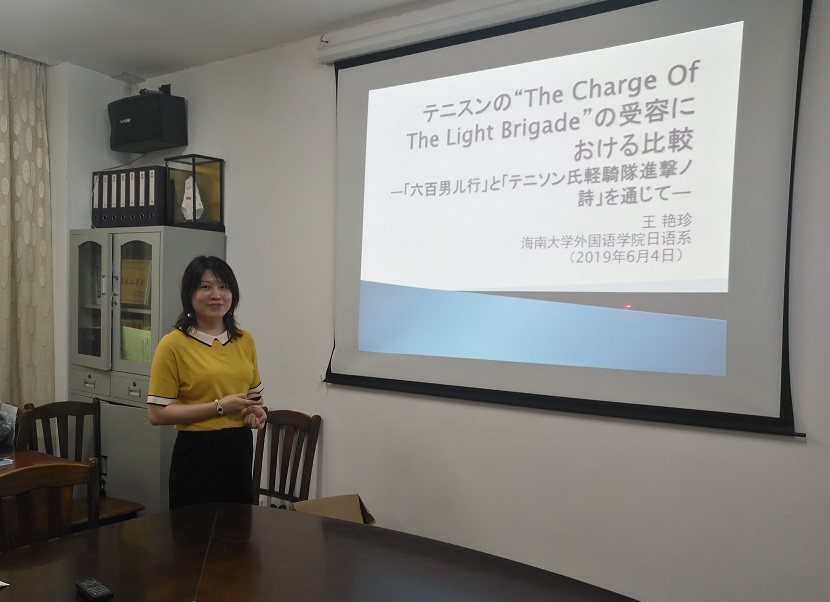王艳珍老师是日本名古屋大学博士,主要进行比较文学的研究。本次分享会上,王艳珍博士就胡适的译诗《六百男儿行》和外山正一的译诗《テニソン氏軽騎隊進撃ノ詩》进行了对比和探讨,指出胡适和外山正一虽然都是通过这首诗抒发自己的感情,但在翻译上外山正一明显比胡适多更多大胆的修改和删减,而胡适在原诗的基础上,删译、加译来确保诗体的完整性和可读性,外山正一和胡适不约而同地在诗歌的最后一部分,都避过原诗关于指挥错误造成的悲壮结果的指责,着重翻译并加译来歌颂士兵们的英勇战斗的场面,这样恰恰证明了他们不仅是那个时代的代表者和发声者,他们的译诗也是那个时代的产物。