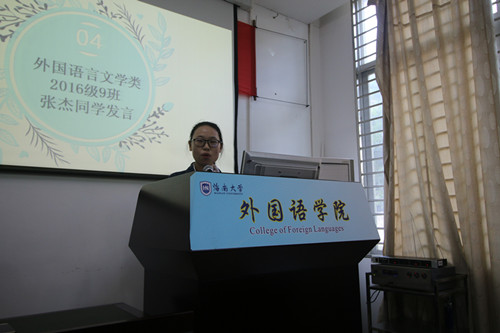 紧接着,学生代表2016级外国语言文学类9班张杰同学发言。张杰从自身经历出发,阐述了养成文明行为、构建文明校园对大学生成长成才的重要意义,并代表全体外院学子郑重承诺“垃圾不落地、脏话不出口、污渍不上墙、上课不迟到、学习不放松、理想不放弃。”