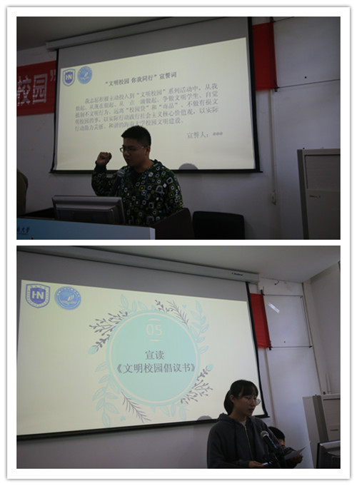 随后,团委干部张翼帆宣读《必赢线路检测3003“文明校园”倡议书》,学生会干部刘宸虎带领全体参会人员宣誓。院长书记带头宣誓,高昂洪亮的宣誓声再次唤醒了大家心中的文明意识,加强了同学们的文明观念。