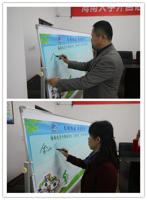 最后,在金院长和黄书记的带领下,全体与会学生排队来到“文明校园 你我同行”宣誓签名板前,郑重写下自己的名字。签名现场气氛融洽,大家积极参与,讨论期待着随后开展的“文明校园”系列活动。