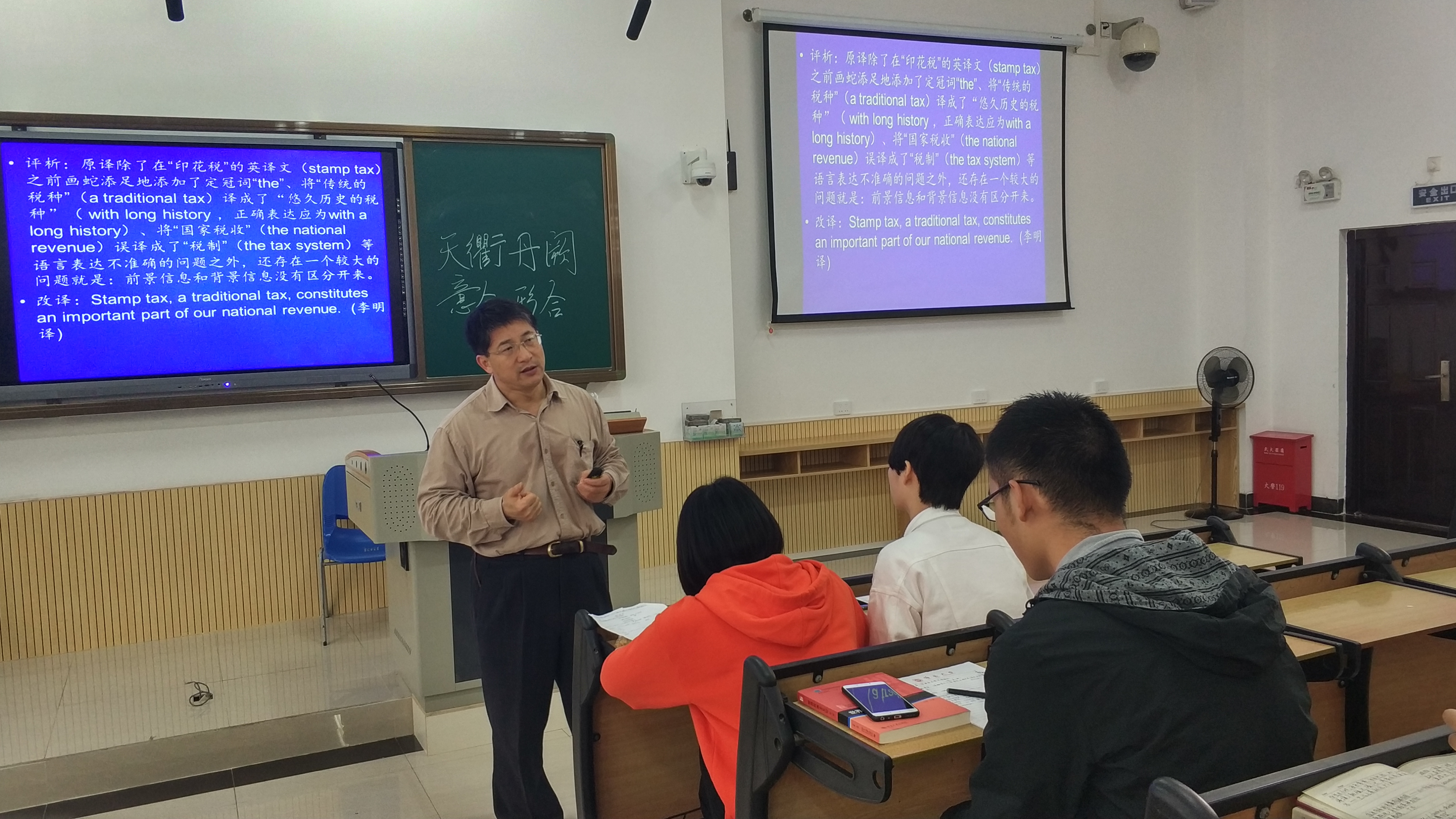 在课程中,李明教授以自《中国印花税票<岭南钩沉>》序言为例,通过对比翻译公司的原译和自己的重译,为我们展示了信息布局的语篇构建作用。他指出翻译应当关照整个语篇为要,要注意前景信息和背景信息在整个篇章中的布局。李明教授希望今后有志于从事翻译工作的同学们能够严格要求自己,打好语言基本功,广泛阅读,提升翻译水平,为将来的翻译打下扎实的基础。