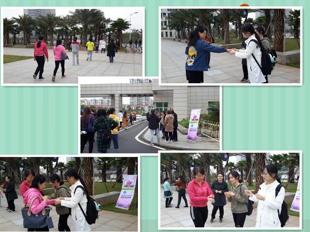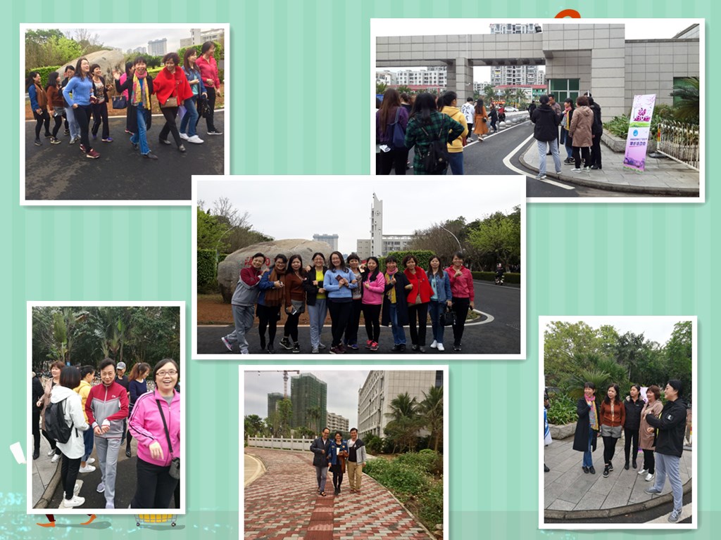 3月8日下午5:00,由金山院长、黄丽芹书记带队从社科楼广场出发,几十人的队伍浩浩荡荡、井然有序地穿越校园。在雨后清新的空气里,漫步春天美好的校园。每个途径点,都有学院大学生志愿者驻守并提供服务。许多男教工同事也纷纷加入步行的队伍,老师们一路健行、聊天、留影、观光,一派热络祥和的气氛。终点站,等待大家的工会老师们,则为大家准备了美味可口的食物饮品和惊喜礼物,大家度过个健康、快乐的节日。