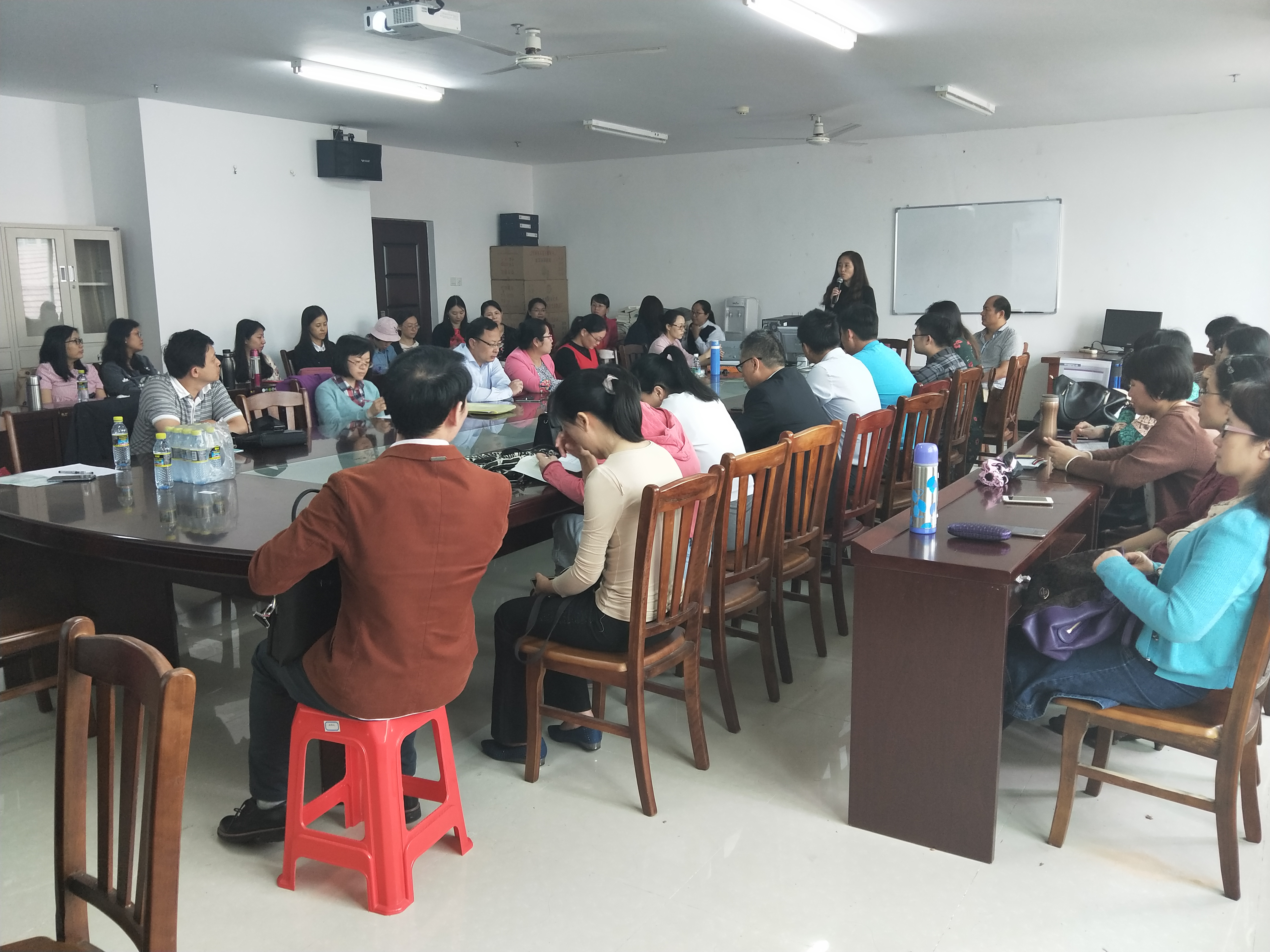 2018年4月17日下午,必赢线路检测3003大学英语第二教研室在社科楼C-415举办了教研活动。邀请了从国外进修回来的孙成平副教授跟大家分享国外学习的经验和收获。金莹副院长和大学英语第一、第二教研室全体教师参加了此次教研活动。活动由第二教研室主任王晓燕主持。