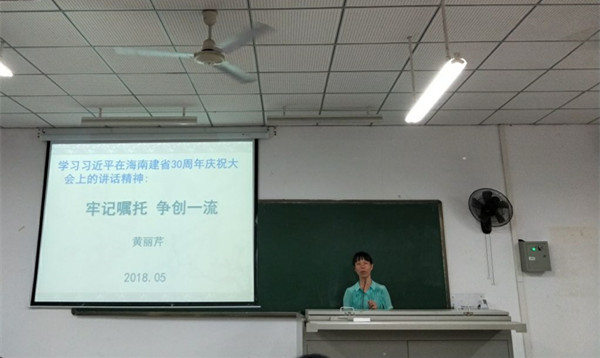 海南建省办经济特区30周年庆祝大会后,学院党委制定了《关于开展“深入学习贯彻习近平总书记在海南建省上的重要讲话精神加快世界一流学科创建步伐”大学习大研讨大落实活动实施方案》,在全院掀起学习习近平总书记“4·13”重要讲话和中央12号文件精神的高潮,并结合学科建设、人才培养进行大研讨,学院党委书记黄丽芹、张乃脆副书记及辅导员通过《形势政策》课、主题团日活动的形式开展理论宣讲。