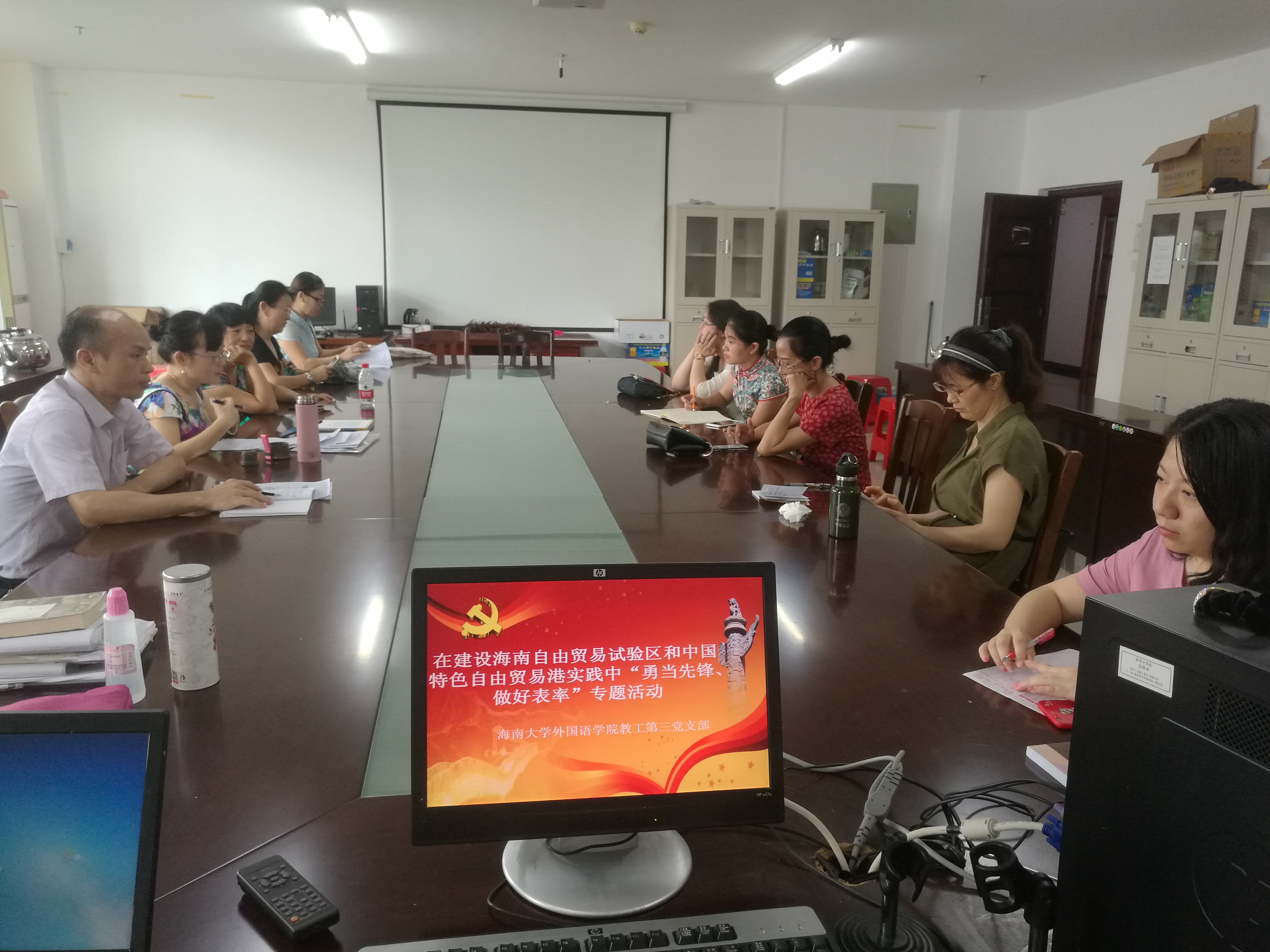 2018年9月29日下午,必赢线路检测3003教工第三党支部在社科楼C415会议室召开支部大会,开展“在建设海南自由贸易试验区和中国特色自由贸易港实践中‘勇当先锋、做好表率’”主题党日活动。会议由支部书记史康主持。