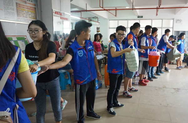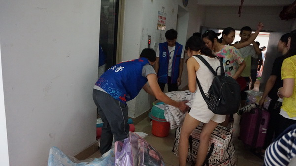 下午4时,志愿者们准时在紫荆公寓门口集合,共同迎接城西校区学生的到来。志愿者们分为接行李组、传送组、电梯口组、楼层电梯组和失物招领组6个组别,每个小组都安排一名团委干部担任组长负责本组工作。随着城西校区同学的到来,各项工作有条不紊进行着。志愿者们动作麻利,在楼道间来回穿梭,他们认认真真地把每个同学的行李安置到位,汗水湿透了他们的衣服,但他们都顾不上休息。下午6时许,城西校区同学们的行李全部归放妥当,搬迁工作圆满结束。