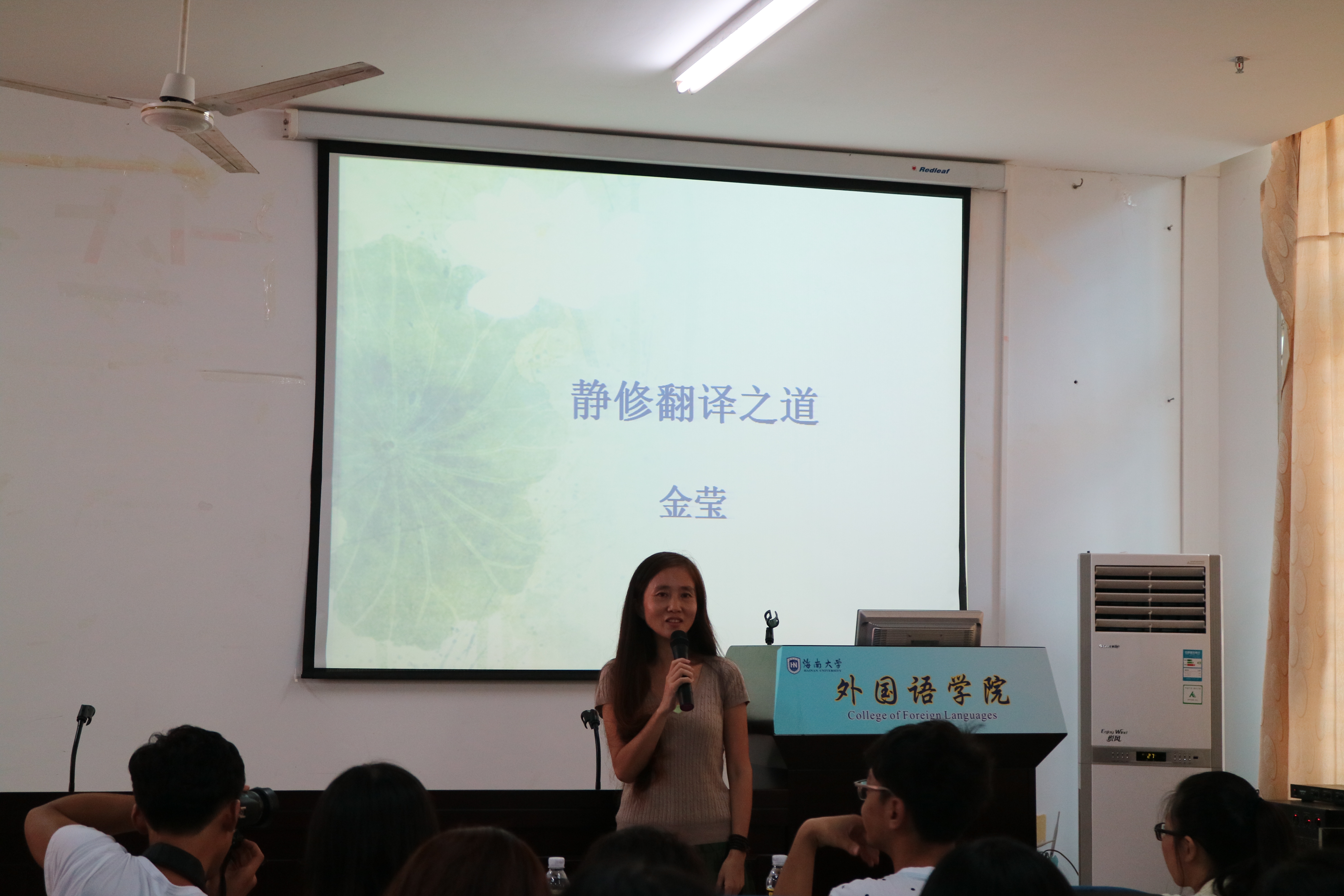 2015年11月10日下午,必赢线路检测3003金莹教授在社科楼C115报告厅举办题为“静修翻译之道”的学术讲座,吸引了众多师生参加。报告厅内座无虚席,过道上也站满了慕名而来的听众。 金莹教授是必赢线路检测3003常务副院长,新西兰奥克兰大学翻译学博士,同声传译员,国家社科规划办中华学术外译项目通讯评审专家。先后在国内外重点大学教授翻译学研究生课程。研究方向为翻译理论与实践。在国内外发表论文,出版专著、译著、主编教材。 金莹教授首先从宏观上指出译者应该从行为习惯、心态、智慧三方面不断提高自身素质。接着,她从内容和语言表达两方面阐释了翻译质量的评价标准,还特别强调翻译是处理信息的过程,因此,要做好翻译,译者要深入地理解翻译原文,善于利用平行文本,充分考虑到目的语读者的语言习惯和文化背景;在口译中要善于把握说话人的意图,加强逻辑思维能力。她继而给出了提高口译能力的三点建议:加强公开演说的能力,注重比较原文和译文,多接触真实的英语材料。 此外,她还结合PPT图文展示,用生动形象的翻译实例对翻译理论概念进行了剖析和诠释。在讲座的互动环节,听众踊跃提问,金莹教授耐心细致地进行了解答。 金莹教授的讲解深入浅出,语言幽默,案例内容贴近学生生活,展示了扎实的语言功底、丰富的翻译实战经验和深刻的人生智慧,给在座的师生留下了深刻的印象。讲座结束时,全场听众对金莹教授的精彩演讲报以了热烈的掌声。