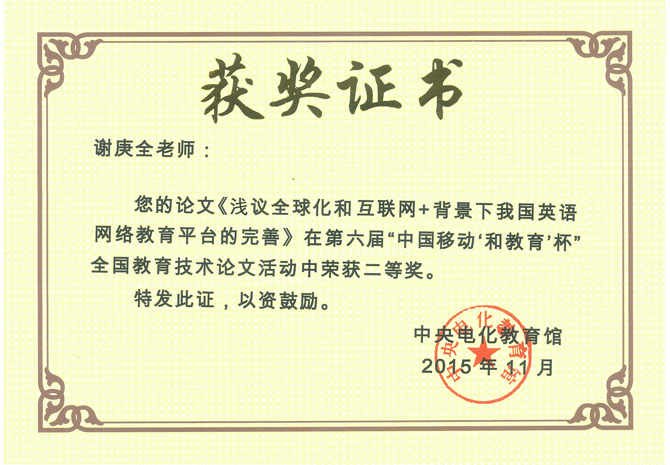 由教育部科学技术司和基础教育二司指导,中央电教馆主办的第六届“中国移动‘和教育’杯”全国教师论文大赛近日降下帷幕,我们谢庚全老师撰写的论文《浅议全球化和“互联网+”背景下我国英语网络教育平台的完善》荣获全国二等奖。