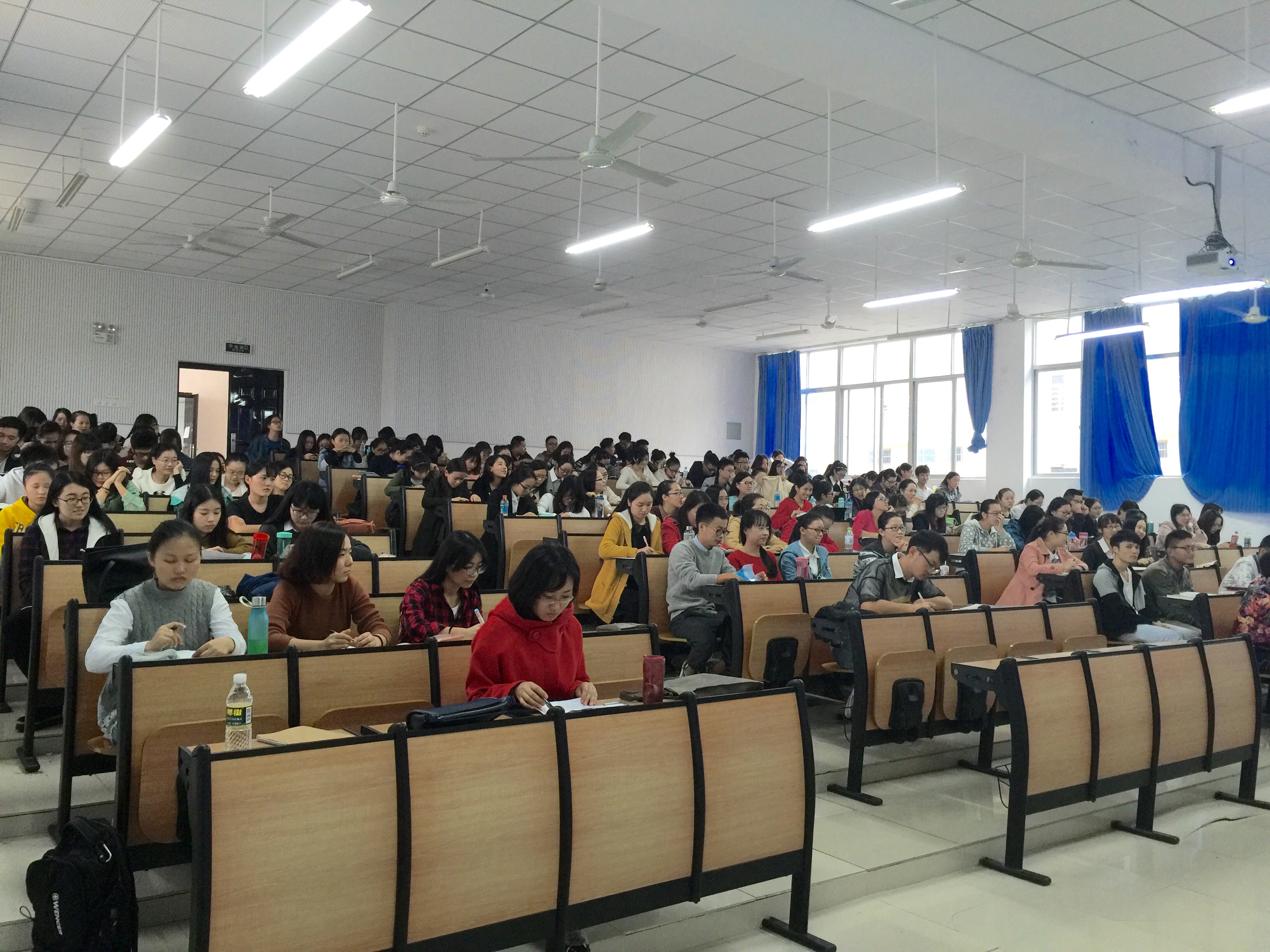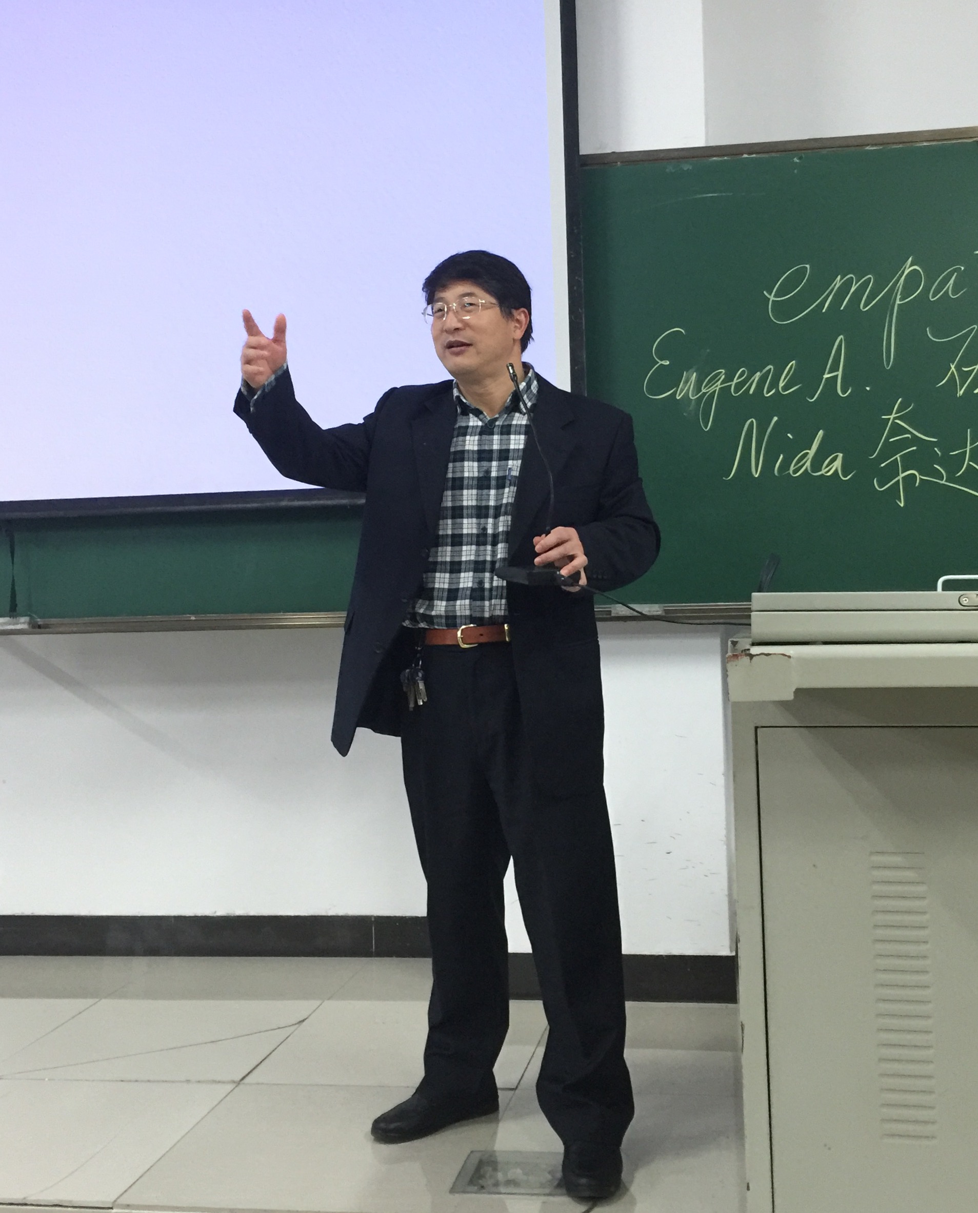 李明教授从翻译的角度谈跨文化交际,主题是“情动于中而行于言——小说翻译中的移情与表达”,讲了三个大方面,分别是前言、小说移情的理据、小说翻译中的移情实例。他认为,做好翻译并不是翻字典查单词简单堆砌这么浅显,真正好的翻译作品是需要很多知识背景的,而跨文化的知识与语言学课程的学习是尤其重要的,只有雄厚的知识基础,才能在语义语用方面掌握机理并达到成功。在随后的讲解中,他更是着重于“移情”的透析,引经据典,并将学生们日常使用的微信语言加以比较,语言诙谐幽默,贴近生活却又能带领学生的思维步步深入。在互动环节中,同学们更是争相回答问题,课堂气氛非常活跃,同学们精神饱满,并认真做着笔记。