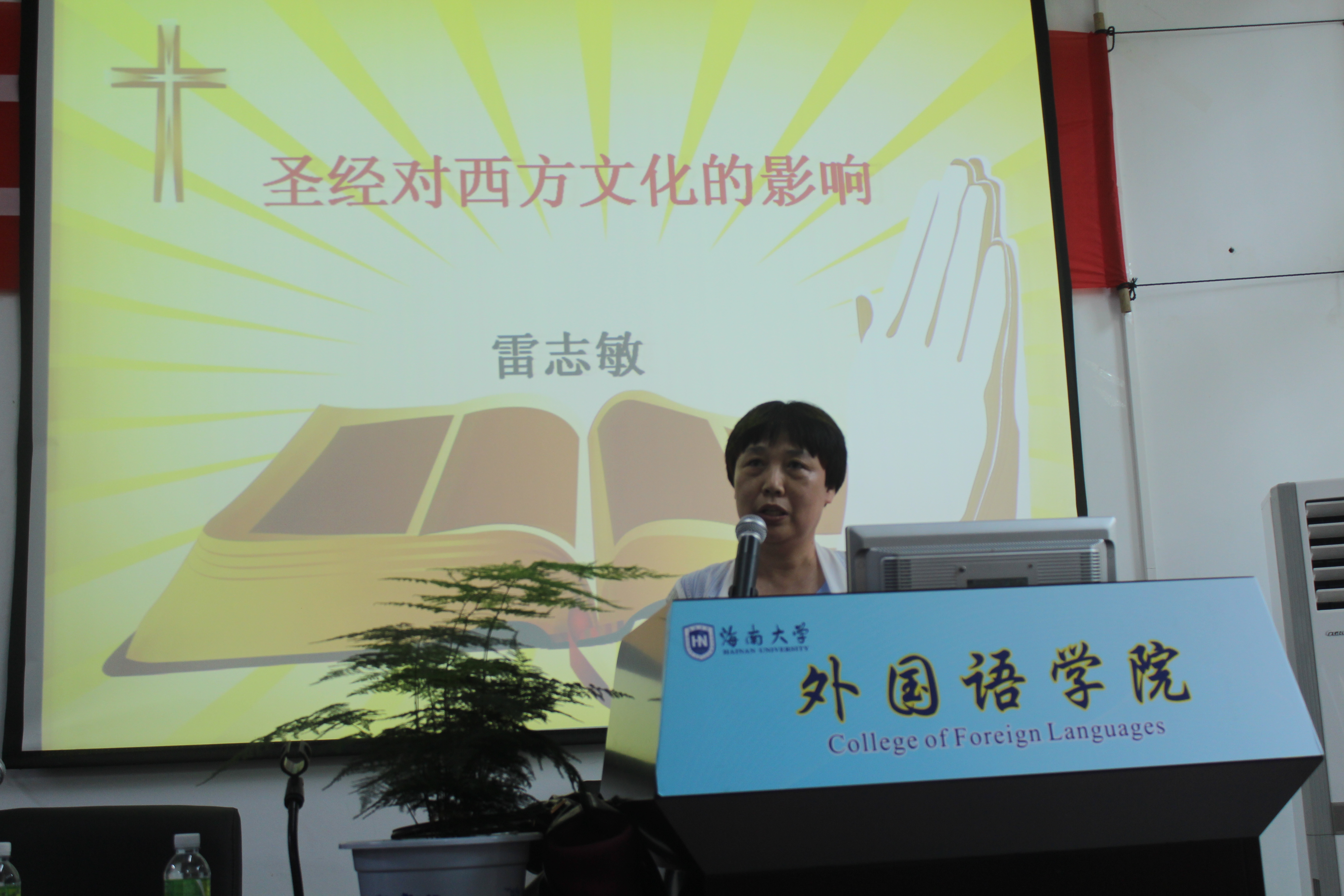 通过多年对《圣经》的研究,雷志敏教授概括了其独特优美的文笔,富有哲理的思想,以及详尽可靠的史料等诸多特点。讲座伊始,雷教授便介绍了39卷《旧约》所涵盖的历史、诗歌、预言,以及27卷《新约》所包括的福音、历史、使徒书信和预言。谈到对西方文化的影响,雷教授首先从星期的来历、词汇的来源、婚礼的仪式、祷告的地点、节日的设立和人名的选取等方面谈了《圣经》对西方国家日常生活的影响。接着,运用奥巴马总统的演讲、《美国独立宣言》等例证,详述了《圣经》对法律、民主和军事等政治领域的渗透与影响。雷教授还进一步指出,米开朗基罗的《最后审判》、乔托的《犹太之吻》和达芬奇的《最后的晚餐》等都是从《圣经》中找到灵感的例证。不仅如此,《弥撒曲》、《受难曲》和《圣诞之歌》等歌曲的题材歌词也都源于《圣经》。文学方面,海明威的《老人与海》、但丁的《神曲》和弥尔顿的《失乐园》等都有《圣经》的影子,而萧伯纳甚至在每部戏剧中都会引用圣经句子。以此为证,雷教授认为,《圣经》对西方的影响如水银泻地,无孔不入。