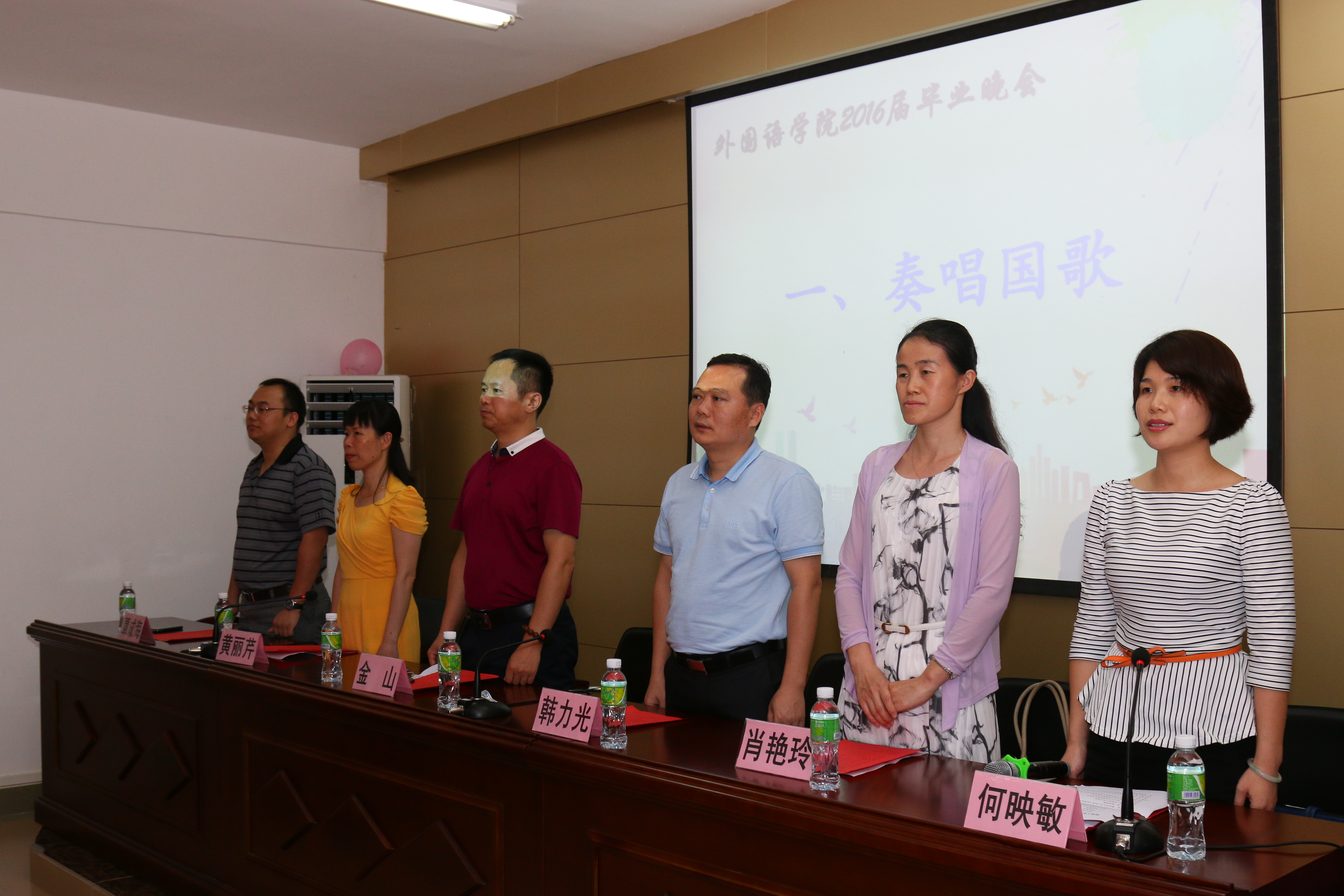 毕业晚会在学生四年成长记录视频与师生祝福视频拉开帷幕,金山院长在晚会上致辞,对即将毕业离开校园、踏入社会的莘莘学子寄予了殷切的厚望和满满的祝福,对毕业生顺利毕业和在大学四年所取得的荣誉表示祝贺,勉励毕业生们从容地应对社会的挑战,投身社会,不断进取、勤奋执着。党委黄丽芹书记从开学典礼的回忆说起,在开学典礼上黄书记告诉学生们在大学四年的目标是要努力成为中外文化交流的使者,希望毕业生继续朝着这个目标努力,并对毕业生们提出四点期望:常记梦想、常怀感恩、坚持学习、坚守良知。班主任代表郭锦萍老师和毕业生代表周瑞同学发言,分别从老师以及学生的角度发表感想,怀念大学期间的师生之情,并给毕业生们表达祝福与期望。晚会上学院肖艳玲副院长宣读学院优秀本科生毕业论文表彰文件,对2016届本科优秀毕业论文获奖同学进行了表彰。