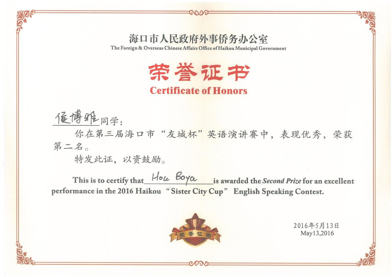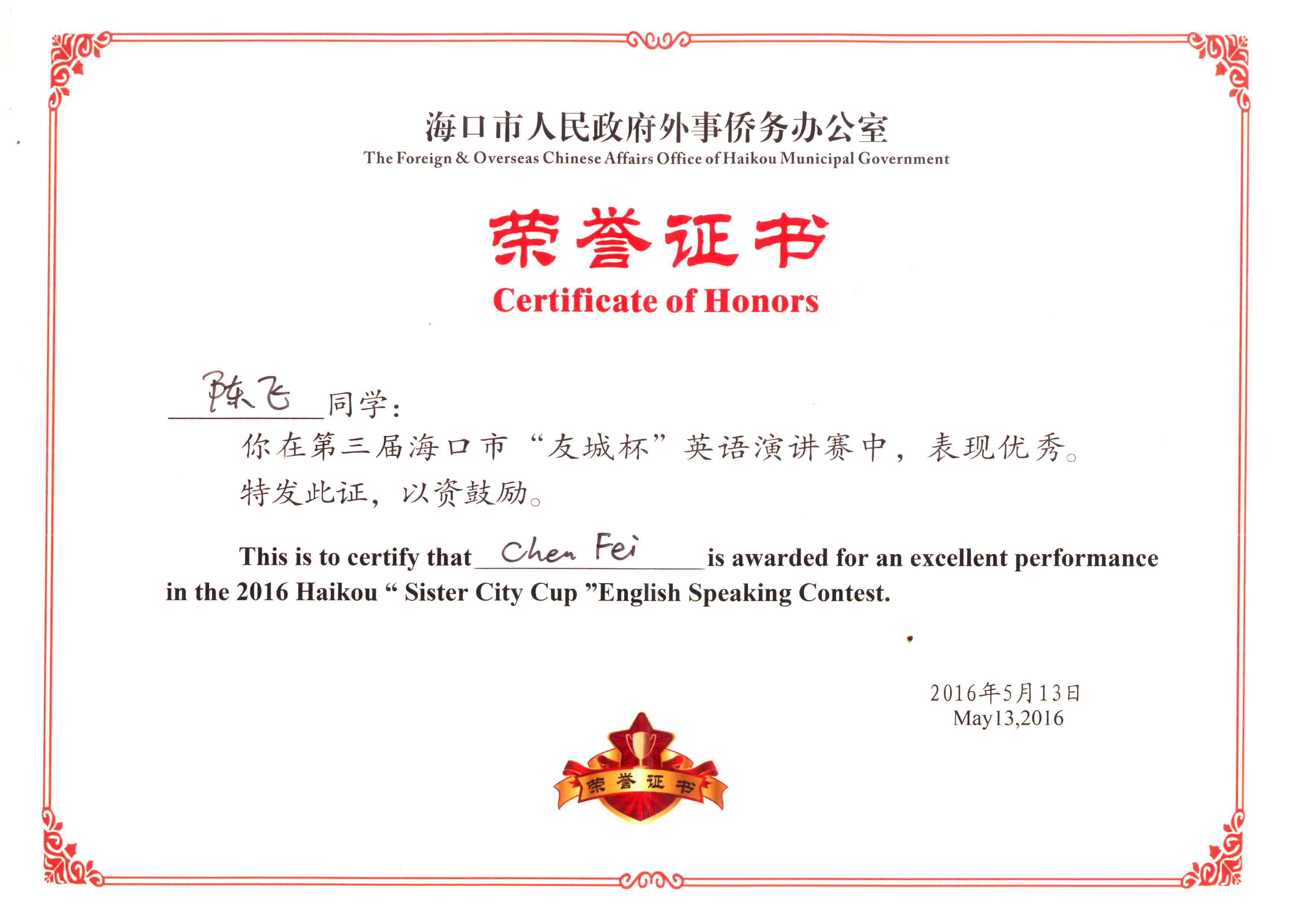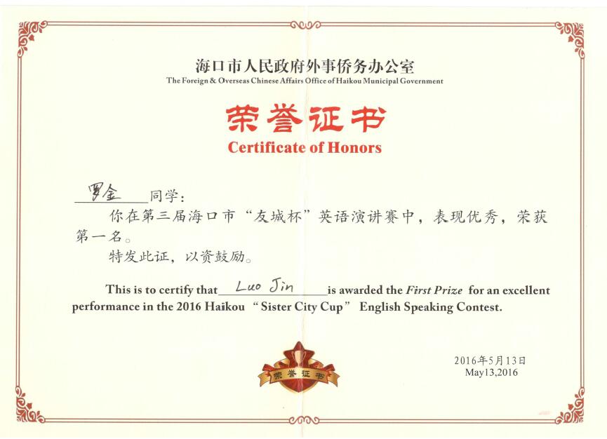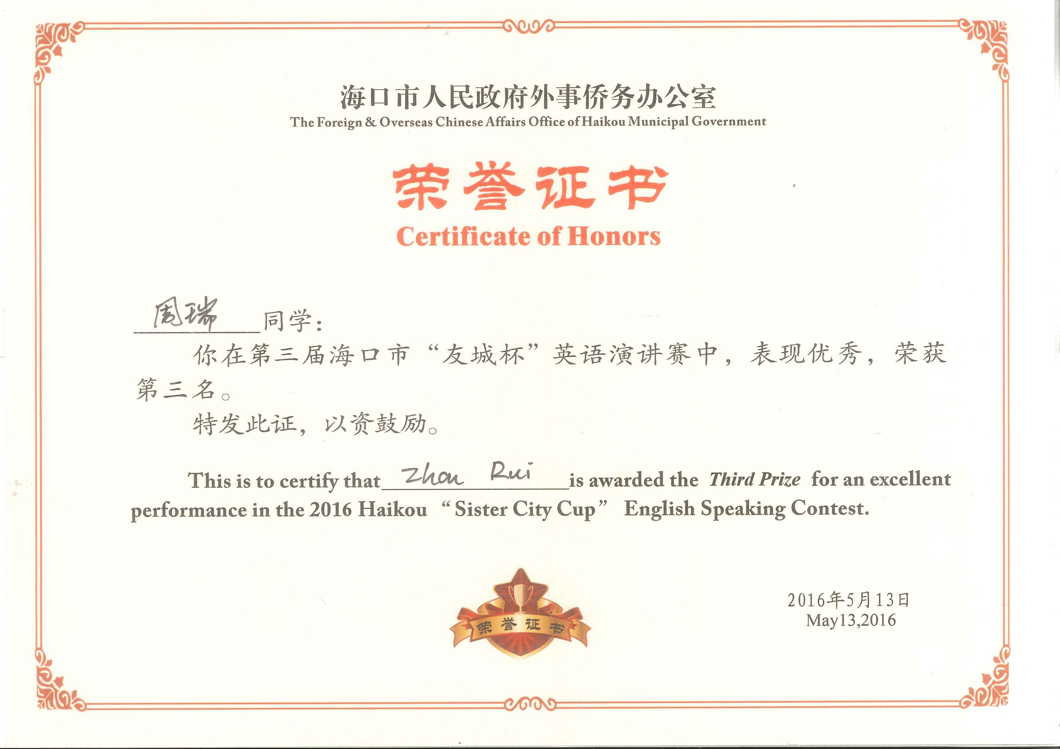 2016年5月13日星期五下午,第三届海口市“友城杯”英语演讲赛决赛在3003必赢官网行政楼一楼会议室胜利落下帷幕。我们参赛选手以地道的发音、雄辩的口才和敏锐的思维一举斩获冠军、亚军、季军及优胜奖所有奖项。 “友城杯”英语演讲赛由海南省外事办主办,每两年举办一次,目的是为海口市培育和储备高层次外语人才,助力海南国际旅游岛建,扩大对外合作,落实“一带一路”倡议。
