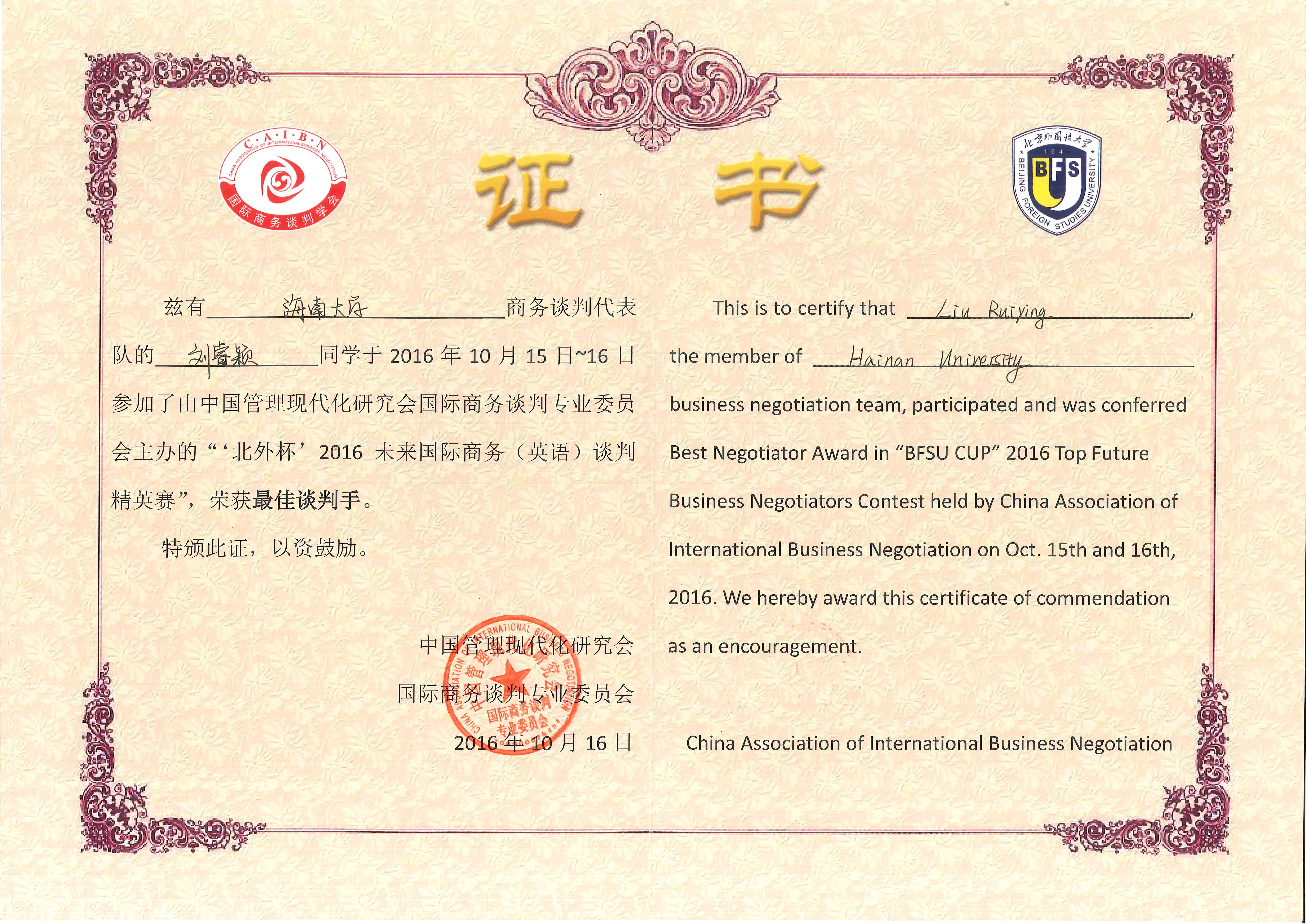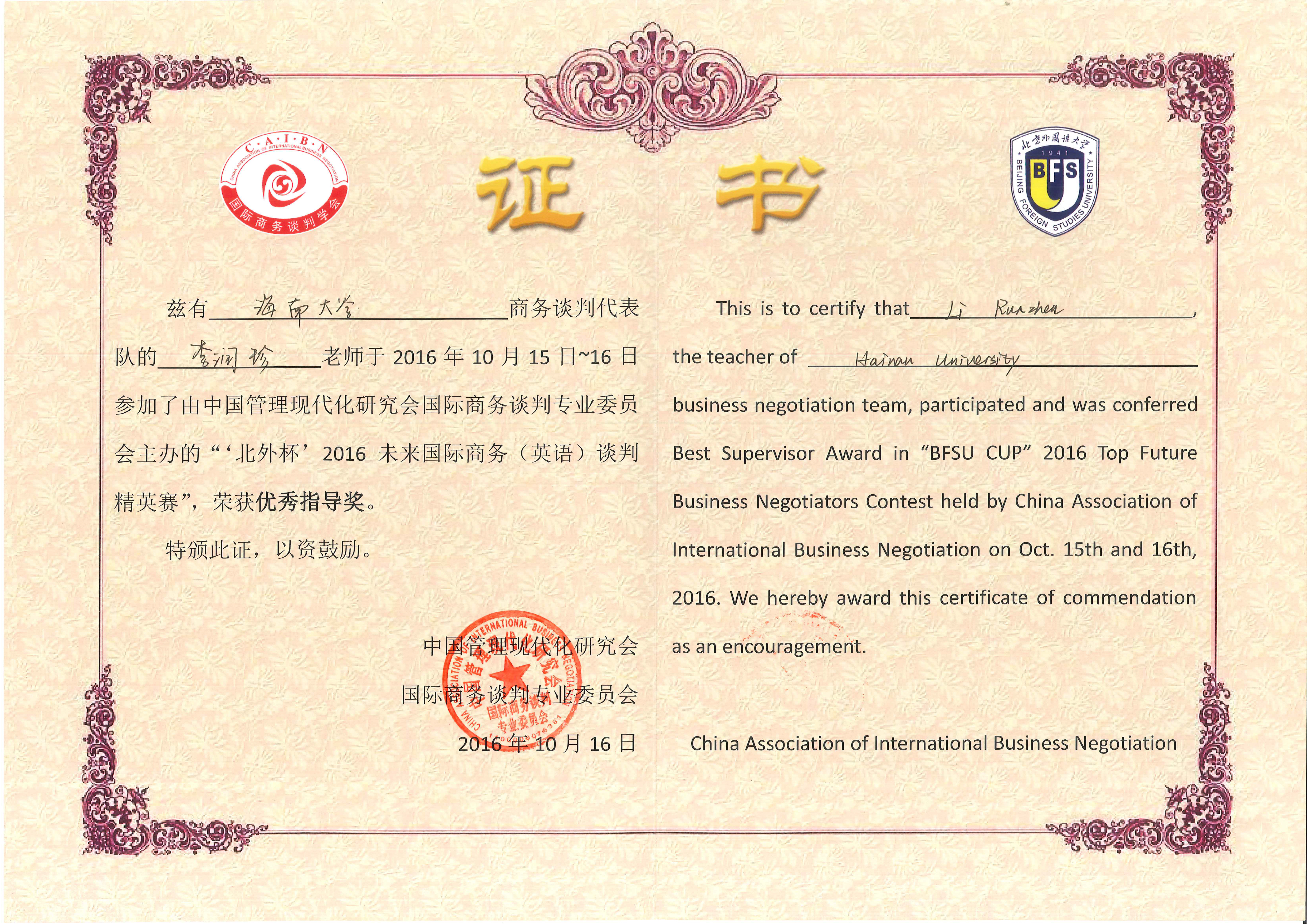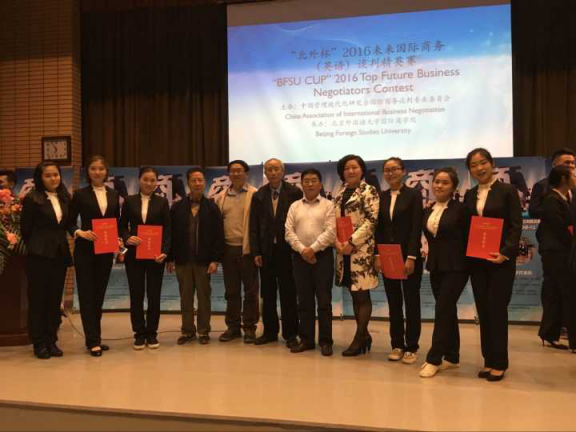 2016年10月15-16日,在北京外国语大学举行的“北外杯”2016未来国际商务(英语)谈判精英赛中,由必赢线路检测3003李润珍老师带队的3003必赢官网代表队表现优异,取得了“团体一等奖”的好成绩,李润珍老师获得了“优秀指导老师”的称号,刘睿颖同学获得了“最佳谈判手”荣誉。