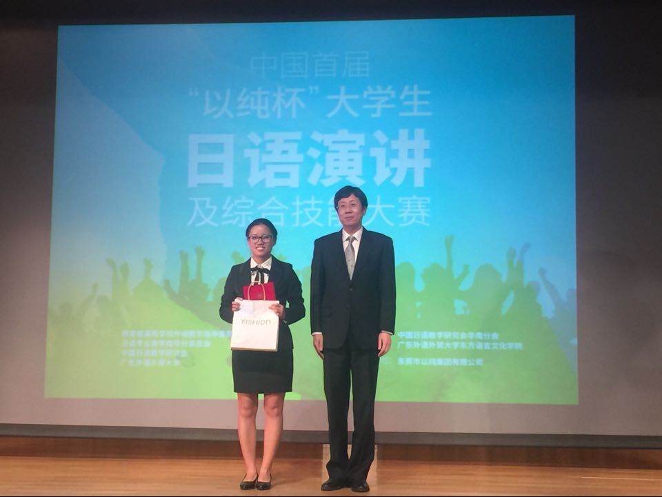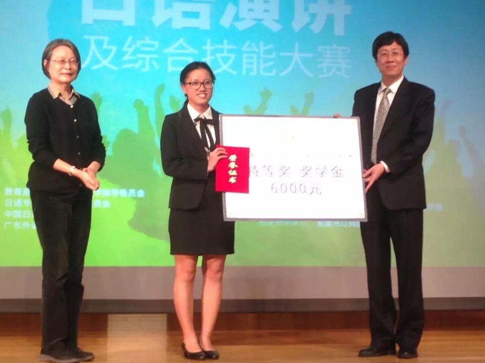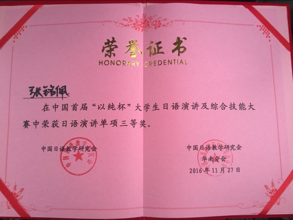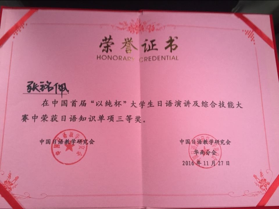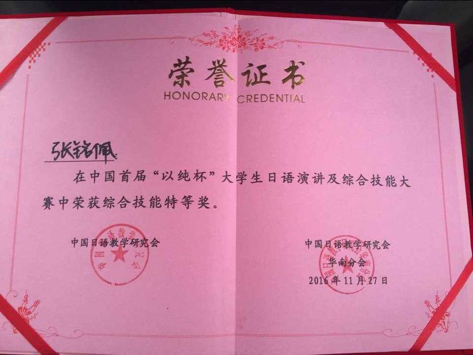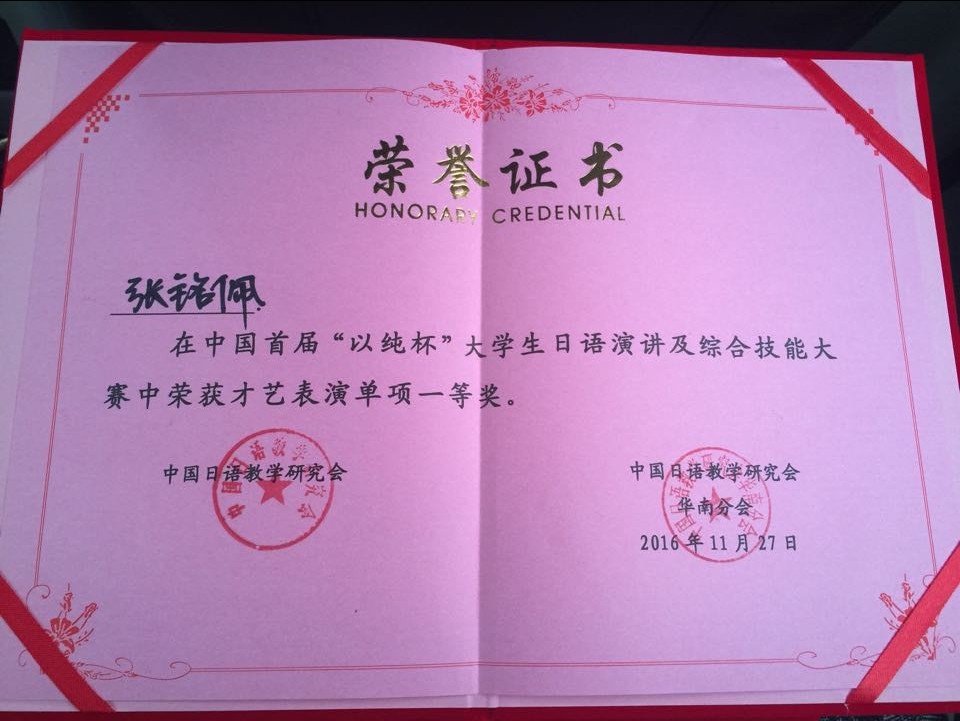 2016年11月27日,于广东外语外贸大学举办的中国首届“以纯杯”大学生日语演讲及综合技能大赛中,必赢线路检测3003日语系2013级张铭佩同学荣获唯一一项最高奖项——综合技能特等奖。在单项技能中分别荣获才艺表演一等奖、日语即兴演讲三等奖、日语知识速答三等奖,并获得六千元奖励。这是必赢线路检测3003学生在全国大赛中首次获得国家级特等奖。