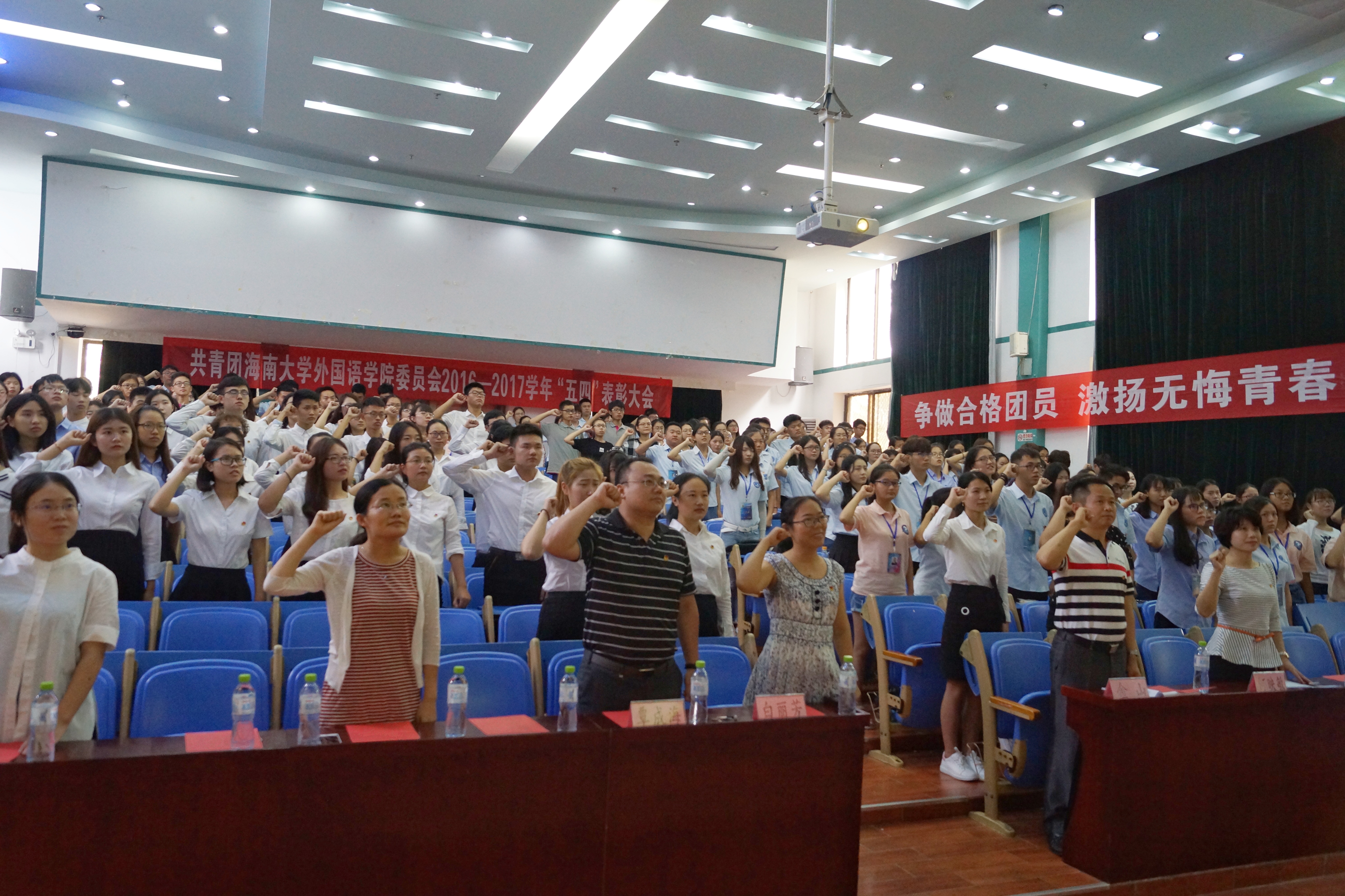 “我们是五月的花海,用青春拥抱时代,我们是初升的太阳,用生命点燃未来……”,当激扬人心的团歌响起,全体共青团员起立高声奏唱团歌,慷慨激昂的旋律将全场气氛引向高潮。接着,由金山院长发言致辞,他向在座的各位团员青年提出了三点殷切期盼:坚定信念,志存高远;全面品德,成长成才;投身实践,争做先锋。随后,王一钦同志带领团员青年重温入团誓词,当铿锵有力的誓言响彻整个大厅时,昔日许下的誓言又再一次点燃外院团员青年萦绕在心中的赤子情怀。之后由学院党委副书记何映敏同志宣读先进个人和集体的名单,现场各位领导嘉宾为获奖代表颁奖。2014级英语1班团支书韩悦和研究生团总支书记辛若晨相继代表优秀共青团团干部和团员发言。在激情洋溢的发言后,党委副书记何映敏同志向全院团员青年提出要求,何映敏同志在讲话中为各位团员青年梳理了一遍总书记在上任之后对于青年的要求与希望,以八字真经,十六字诀为基础,争做六有青年。结合学院团委正在开展的“一学一做”教育实践,何映敏同志提出了合格团员的标准,即把总书记对青年的要求,学习好、领会好,结合个人的生活实际,结合现在的学习把工作做好,就是一个合格的团员。