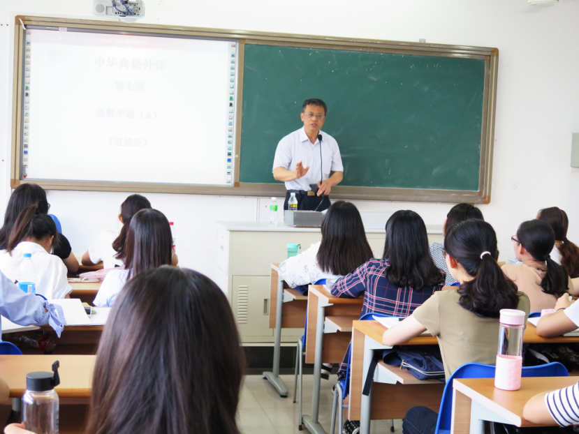 上午一、二节课,来自上海大学的冯奇教授为同学们讲解了《道德经》的英译,他介绍了道家经典《道德经》英译的历史,比较了赵彦春、Arthur Waley、许渊冲等不同译者对字、词、句等处理的差异,他认为道家经典的微言大义、博大精深,译者总是试图在形式和意义、源语和目的语之间取舍,寻找理想的平衡点。
