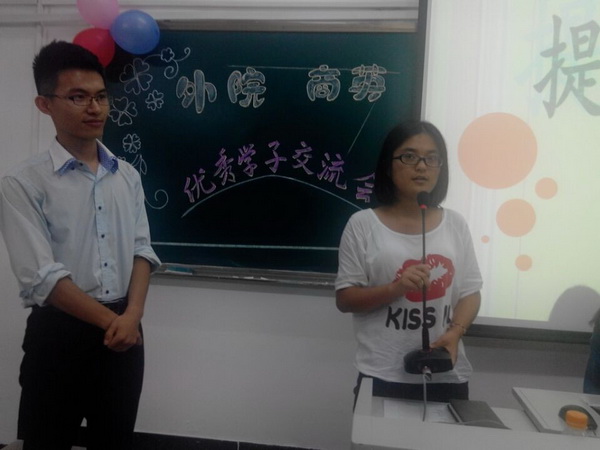 第一批参与交流会的是2014级商英一到四班,随后是商英五到八班。伴随着充满活力的音乐,主持人宣布交流会正式开始。首先,四位优秀学子分别向新生们分享经验。其中,卫姝卿同学分享了自己去台湾国立成功大学做交换生的经历,并告诉大家,大学的可贵之处在于能够提供给大家一个更广阔的平台,引发了同学们对大学的思考。她的演讲精彩生动,为同学们的大学生活带来了无限的憧憬,很多同学表示,大学四年要好好学习,争取能够像卫学姐一样做交换生,体验更广阔的平台。卫姝卿的演讲博得了在场同学的阵阵喝彩,激发了商英的新生们抓好专业、刻苦学习的毅力和决心,推动交流会达到预期的效果。在接下来的提问环节中,新生们主动提出自己遇到的疑难困惑,优秀学子们也热心地进行解答,并将自己平时学习以及调节心态的方法教授给大家。