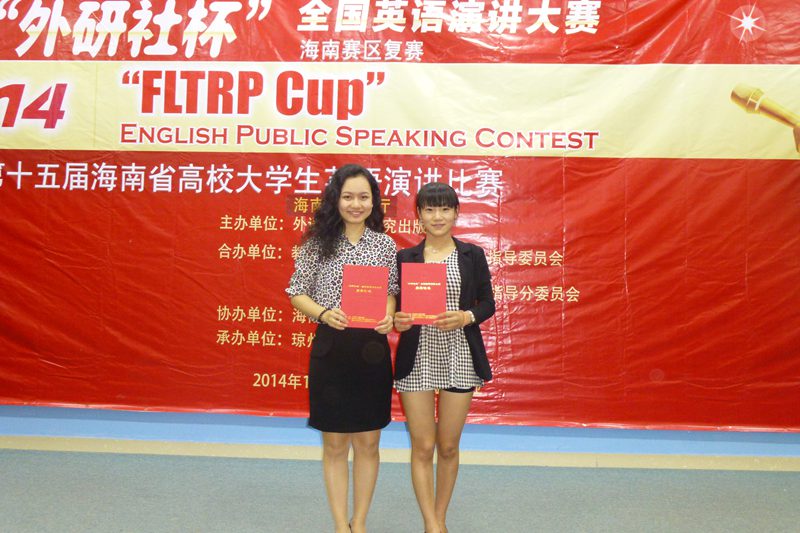 第十五届海南省高校大学生英语演讲比赛暨2014年“外研社杯”全国大学生英语演讲大赛海南省复赛于10月26日在琼州大学举行,经过激烈的角逐,我们选手2013级英语翻译(口译方向)专业林杨、2013级文科实验班旅游管理专业彭澜两位同学分别获得了演讲大赛专业组及非专业组特等奖。