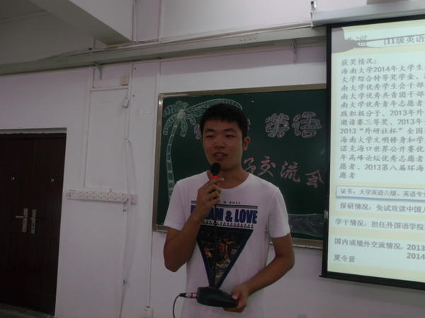 伴随着优美的旋律和主持人简洁流畅的开场白,会议正式开始。四位优秀的学子在大家热烈的掌声中分别上台发表讲话。首先,曾经由中文专业转入经贸英语专业的郭嘉碧同学以自身经历激发了同学们学好英语的热情和信心,令他们倍受鼓舞。接着,刚从英国纽卡斯尔大学交换学习回国的梁梦晓同学用幽默风趣的语言博得了现场同学的欢呼和掌声,他告诫同学当学习和课外活动发生冲突时,应该衡量两者的利弊和重要性以做出最适合自己的选择。而谷慧同学则以学习目标为主要切入点,建议同学们要坚定自己的人生目标,并为之努力,终将收获成功的喜悦。最后,被评为2014年3003必赢官网十大年度人物之一的姚遥同学回忆了他大一班主任说过的一句话:“We’re suffering,we enjoy”,并将全场氛围推向了高潮,他强调学生干部的工作和学习并不是冲突的,大家要学会妥善利用零碎时间,以达到事半功倍的效果,点燃了在场同学克服困难,迎难而上的斗志与勇气。