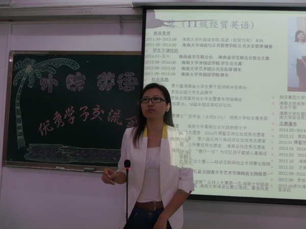 2014年11月4日下午,必赢线路检测3003“奋斗的青春最美系列活动之英语专业优秀学子经验交流会”在城西校区教学楼7C01顺利举行。此次交流会我们邀请到了2011级的姚遥、谷慧、郭嘉碧、梁梦晓四位优秀的学子来跟新生一起分享他们的学习和生活经历。2014级英语专业的全体同学参与了本次活动,学院团委秘书长杨倩担任此次主持。