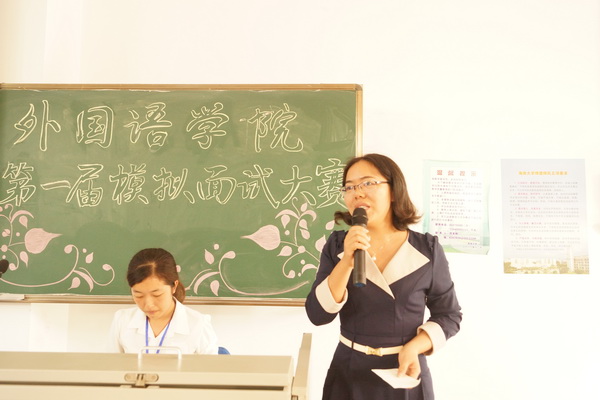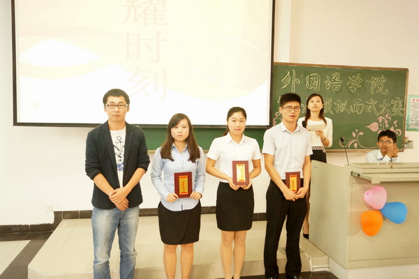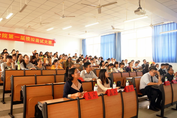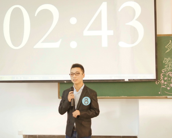 活动伊始,主持人在介绍完到场嘉宾和评委老师后,由白丽芳副院长上台致辞,她对在场嘉宾的到来表示深深的感谢,并简单介绍了本次大赛的意义,最后她衷心地祝愿在场选手取得优异的成绩。在白丽芳副院长振奋人心的讲话之后,比赛正式拉开了帷幕。比赛分为三个流程:14位参赛选手依次上台递交简历;选手在台上做三分钟的自我介绍推荐演讲;面试官提问,选手现场作答。选手们表现得落落大方、成熟稳重,夺得了现场观众热烈的掌声,比赛进入了白热化。在一番激烈的角逐后,最终许泽飞同学以丰富的社会经历和出色的实践能力在众多选手中脱颖而出夺得了桂冠。