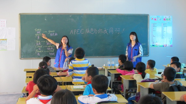 课前,害羞腼腆的孩子们逐渐与志愿者们打成一片。志愿者们耐心的回答孩子们的问题,整个校园充满了欢声笑语。随着上课铃响,各个年级组按部就班的展开了教学计划。三年级组的教学特色在于通过世界地图等图文结合的方式让孩子们形象化的认知APEC参与国,并教授各国英文名称。四年级组则注重通过唱英文歌、团体合作游戏等寓教于乐的方式潜移默化的向孩子们输入英文知识。相较于低年级而言,五年级组则将目光聚焦于“模拟校园峰会”等更为成熟的教学方式来加深孩子们对APEC的理解。最后,支教活动在下课铃声和孩子们依依不舍的道别声中落下了帷幕。