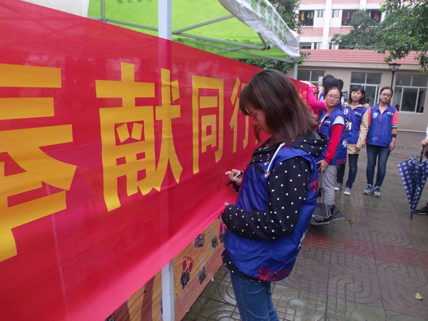 早晨的城西飘着小雨,可却阻挡不了同学们参与活动的热情。活动伊始,一支励志温暖的手语舞表演《天使》吸引了同学们驻足观看,不仅给现场带来了活跃的气氛,还让这飘着零星小雨的会场渐渐温暖起来。在青年志愿者协会会长樊雅茹给同学们简单介绍了必赢线路检测3003青年志愿者协会的日常工作和活动之后,到场志愿者们纷纷举起右手庄严地宣誓,“我志愿成为一名光荣的志愿者。我承诺:尽已所能,不计报酬,帮助他人,服务社会。践行志愿精神,传播先进文化,为建设团结友爱、平等互助、共同前进的美好社会贡献力量。”寒风中一句句掷地有声的宣誓词让我们体会到了志愿者们无私奉献的精神,让我们更加坚定了奉献社会的信念。紧接着,志愿者们轮流在宣传横幅上签字并在留言板上留言,用墨迹见证我们为社会奉献的信心。最后,到场的志愿者冒雨为路过的同学们发放宣传手册宣传并普及志愿知识,志愿者们耐心地为同学们讲解志愿者知识、介绍青年志愿者协会的活动,让同学们对志愿者有了更深一步的理解和认识。
