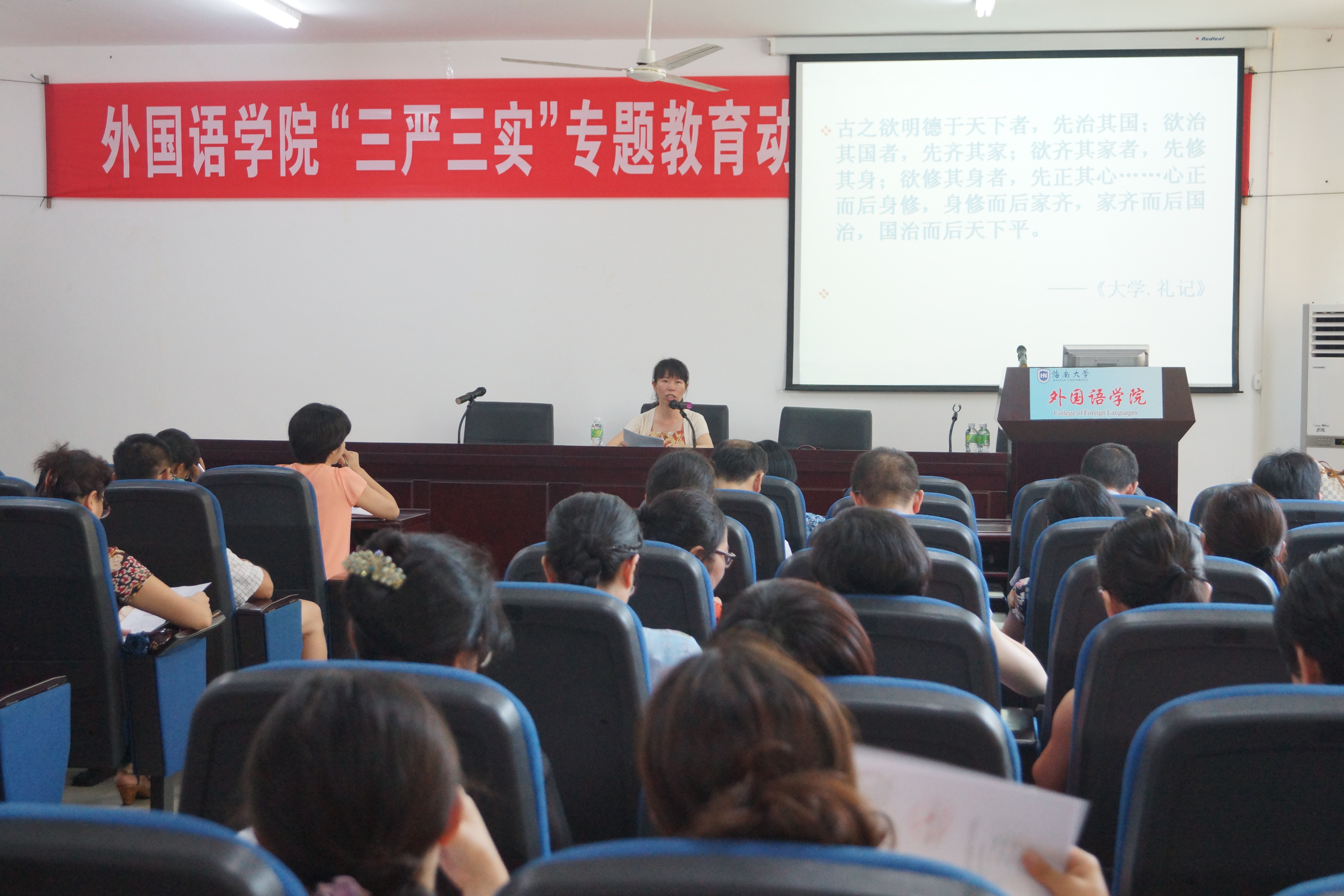 黄丽芹书记还结合我们实际分析了“三严三实”针对的问题,要求学院领导干部、全体党员要加强学习,锤炼党性修养,增强“三个自信”;明大德、守公德、严私德,坚守底线、不碰红线,为自己的道德、灵魂筑起一道防洪线;保持高度的事业心和责任感,提升执行力,爱岗敬业,爱护学生,服务师生;讲奉献,守纪律,自觉维护学校学院的声誉;自觉践行“三严三实”的精神,以“严”字当头、“实”当先,争做方针政策的“明白人” 、廉洁自律的“清白人” 、求真务实的“正派人” 、真抓实干的“带头人” 、师生员工的“贴心人”。